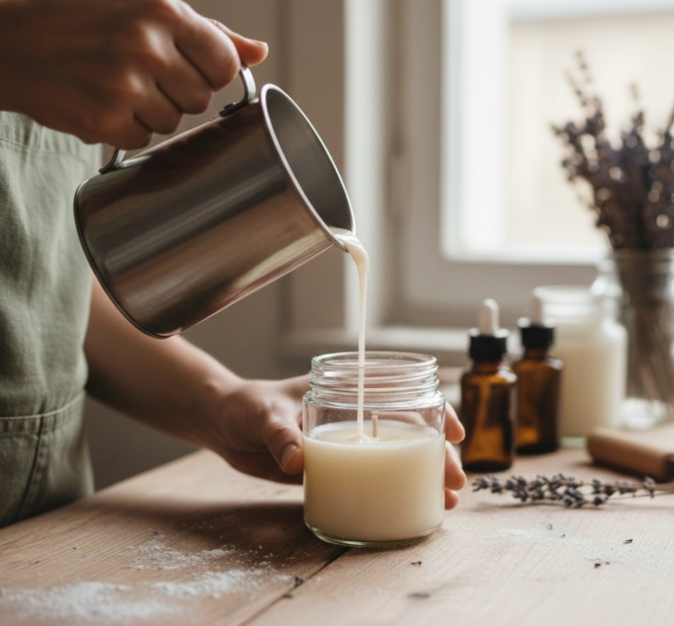 Chaque bougie est coulée avec soin dans notre atelier, pour une qualité artisanale unique.